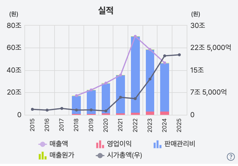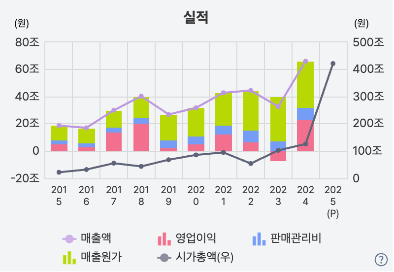 현재 대한민국 주식 시장에서 가장 뜨거운 SK하이닉스의 연간 손익 및 실적 그래프입니다. 과거 반도체 슈퍼 사이클 때 영업이익 20조를 벌던 회사는 24년 HBM으로 인해 23조를 벌며 역대 최고치를 갈아치웠습니다. 2018년 반도체 사이클 대비 주가는 거의 2배가 올랐죠.