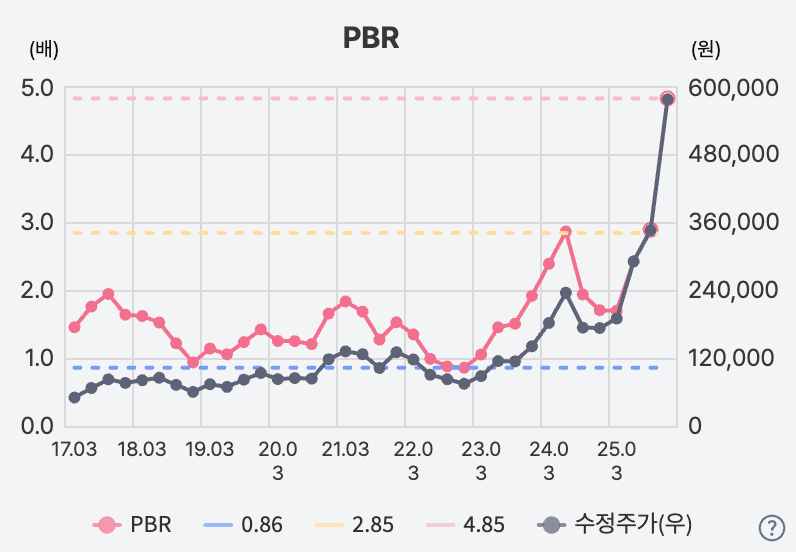 사실 SK하이닉스의 밸류는 PBR로 보면 이미 다 찬 것을 넘어, 굉장한 오버밸류 상황입니다. 너무 비싼 주식이라는 것이죠.